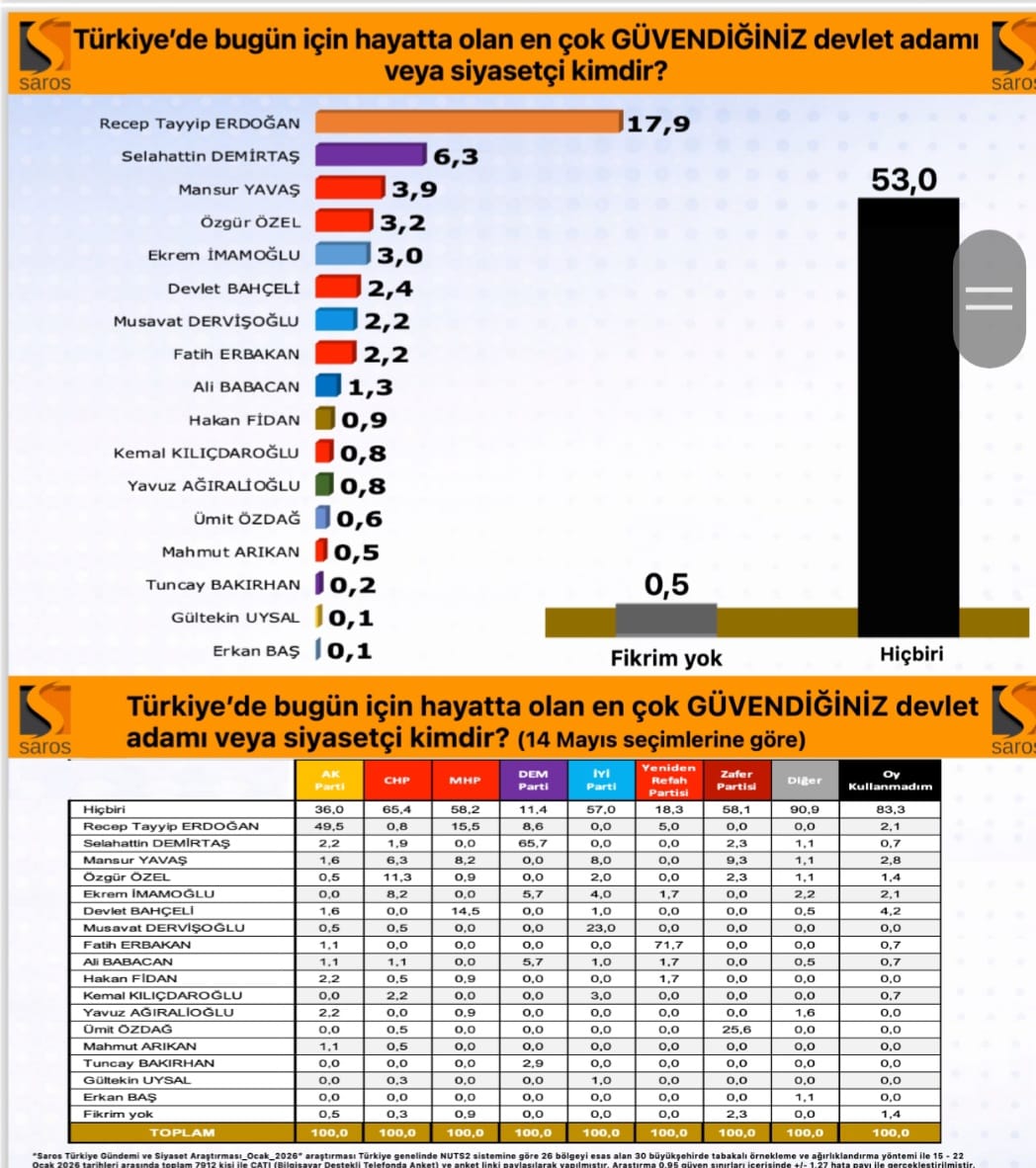 Araştırmanın belki de en düşündürücü verisi, “Türkiye’de en çok güvendiğiniz devlet adamı/siyasetçi kim?” sorusuna verilen cevaplar oldu. Katılımcıların %53,0’ü “Hiçbiri” yanıtını vererek mevcut siyasi tabloya olan güvensizliğini ortaya koydu. İsim bazında ise güven sıralaması şöyle:
