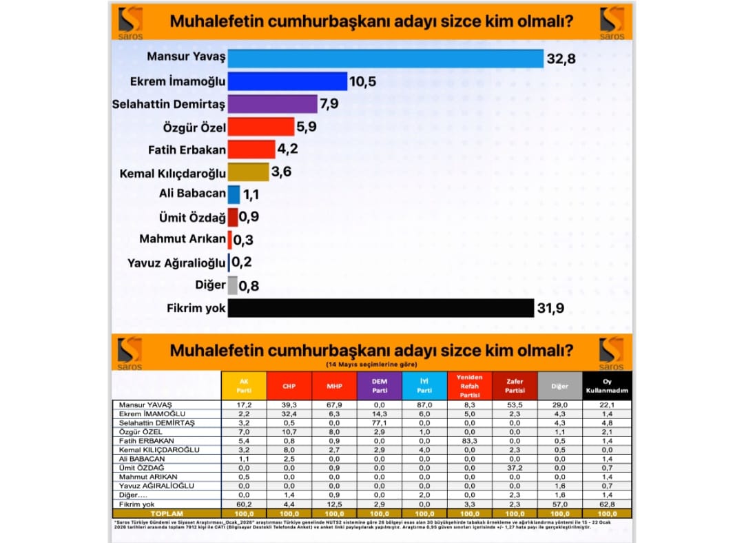 Saros Araştırma’nın Ocak 2026 tarihli “Türkiye Gündemi ve Siyaset Araştırması” sonuçları, olası bir Cumhurbaşkanlığı seçiminde dengelerin Mansur Yavaş lehine değiştiğini ve seçmenin mevcut siyasi figürlere güven noktasında kararsız olduğunu ortaya koydu.
