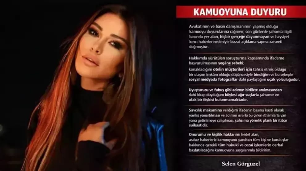 Son dönemde magazin gündemini sarsan uyuşturucu ve fuhuş operasyonunda adı geçen şarkıcı ve oyuncu Selen Görgüzel, sessizliğini bozdu. Sosyal medya hesabından “Kamuoyuna Duyuru” başlığıyla bir açıklama yayınlayan Görgüzel, hakkında çıkan haberlerin gerçeği yansıtmadığını ve onurunun hedef alındığını belirtti.