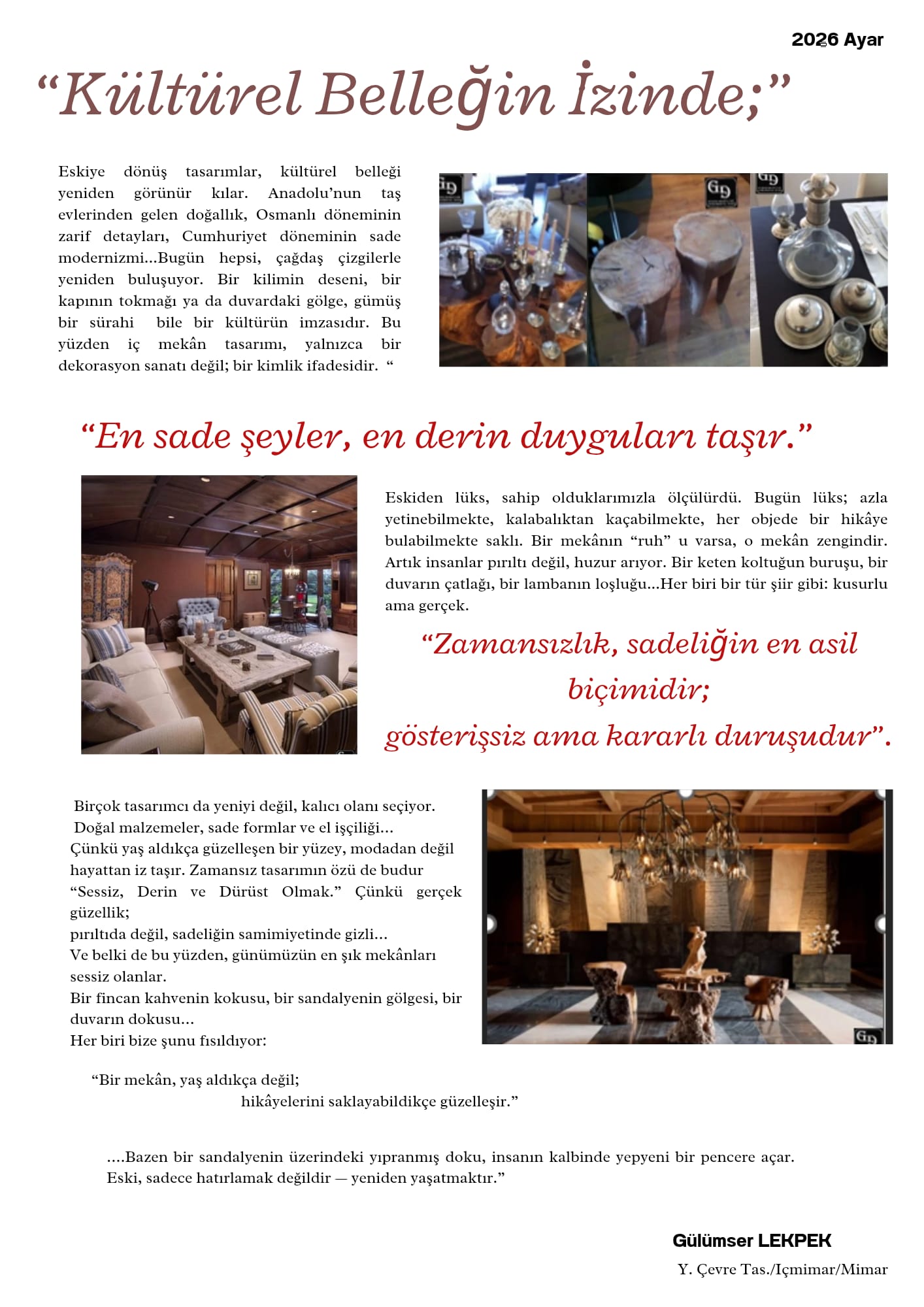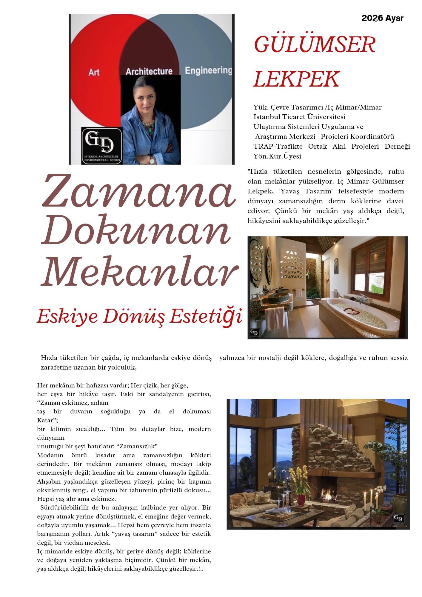 “Hızla tüketilen nesnelerin gölgesinde, ruhu olan mekânlar yükseliyor. İç Mimar Gülümser Lekpek, ‘Yavaş Tasarım’ felsefesiyle modern dünyayı zamansızlığın derin köklerine davet ediyor: Çünkü bir mekân yaş aldıkça değil, hikâyesini saklayabildikçe güzelleşir.”